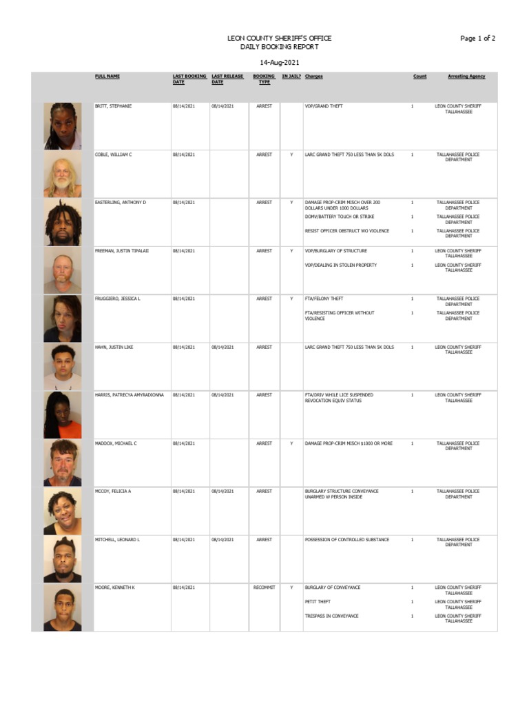 Tallahassee booking report may 16 2021. Days inn tourist accommodation report. Leon county sheriffs office page 1 of 2.