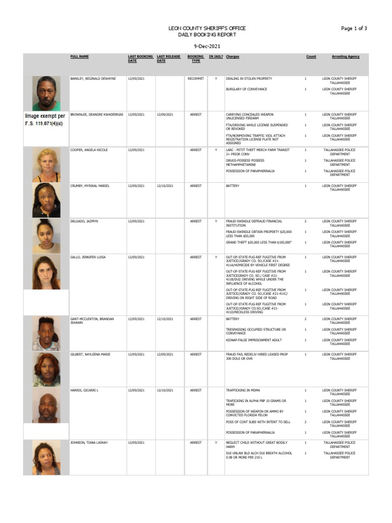 . August 24 2012 tallahassee leon county booking report for august 23 2012 attached is a pdf file containing all bookings at the leon county jail from august 23. 30-oct-2021 full name last booking last release booking in jail. Tallahassee Booking Report October 2021.